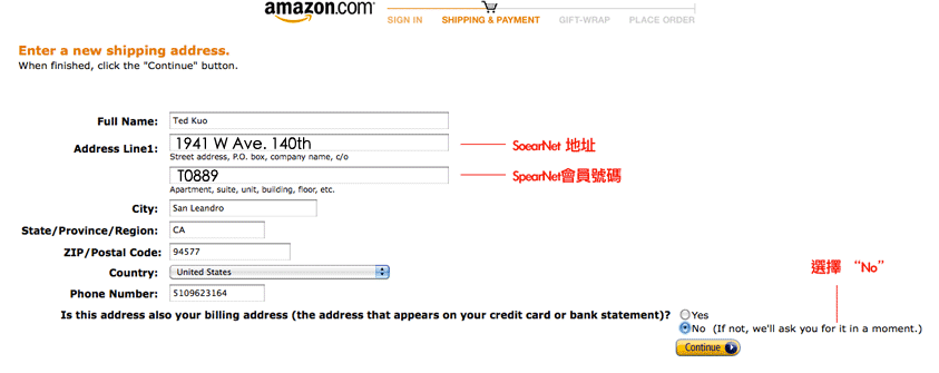在 "Address Line1" 第二行輸入和您的SpearNet會員號碼 例:T0999