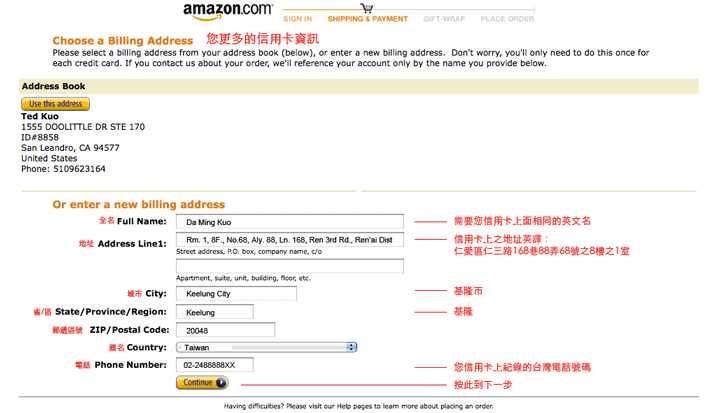 你的信用卡資料已存入Amazon的資料庫中然後在點擊頁面下方的"Continue"到最後一步