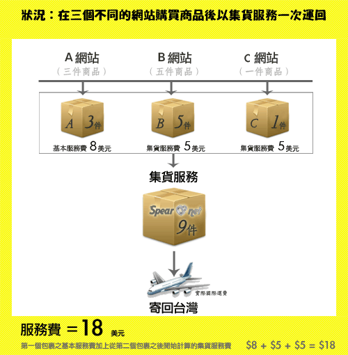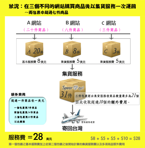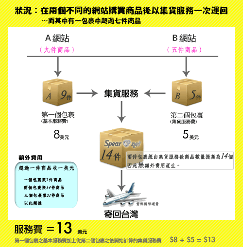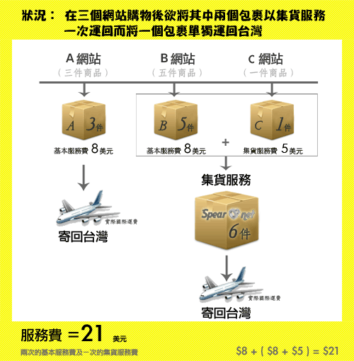 服務費 21美元 (單一包裹A服務費8美元 ) + (第一件B包裹8美元 + 第二件C包裹集貨服務費5美元) + 實際運費。