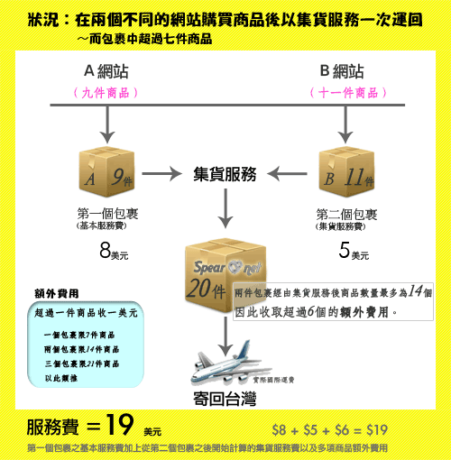 服務費 19美元 (第一件包裹服務費8美元 + 第二件包裹集貨服務費5美元+ 額外費用6美元) + 實際運費。