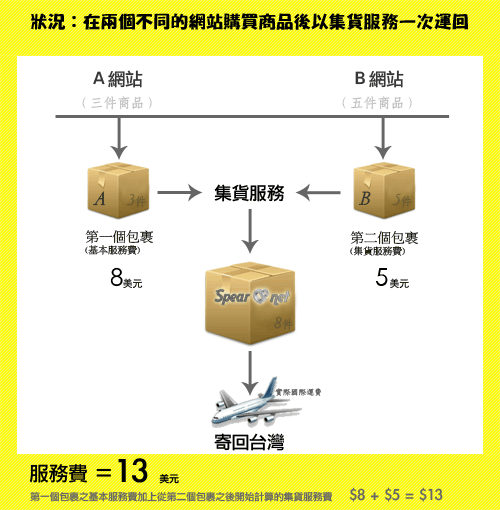 如果您同時想於其他的購物網站購物,並需要我們將多個包裹為您做集貨服務統一裝箱寄出的話,則計價方式如下:第一件轉送包裹收取八美元服務費,第二件集貨轉送的包裹起,每件均只收取五美元的集貨服務費,以此類推。