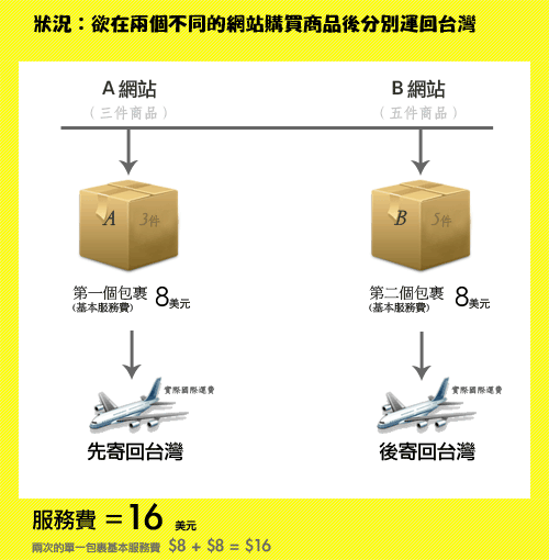 服務費 16美元 (單一包裹服務費8美元 ) + (單一件包裹服務費8美元) + 實際運費。